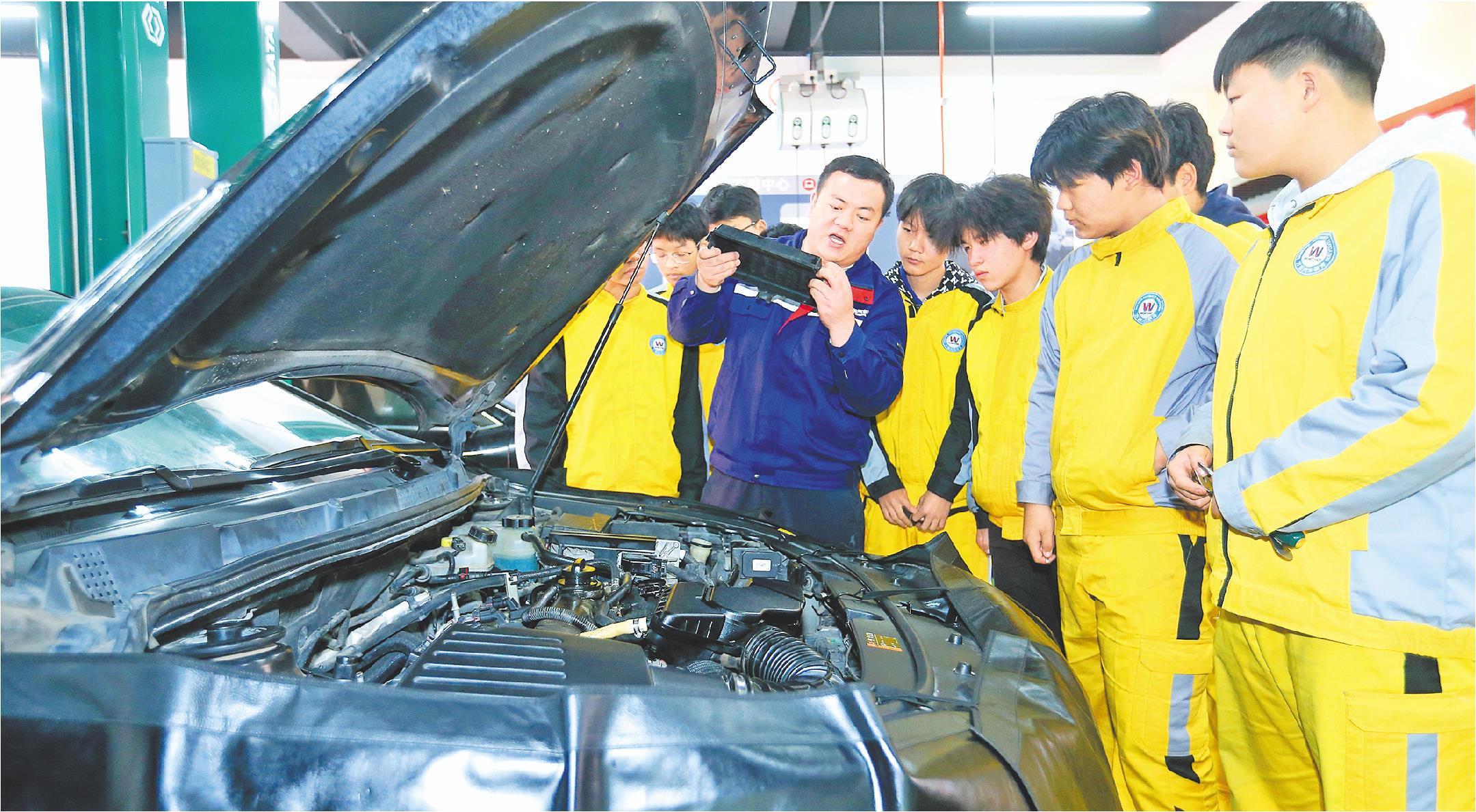 11月5日,青岛市即墨区万通职业培训学校,学员们在老师的指导下参加汽车维修公益培训。